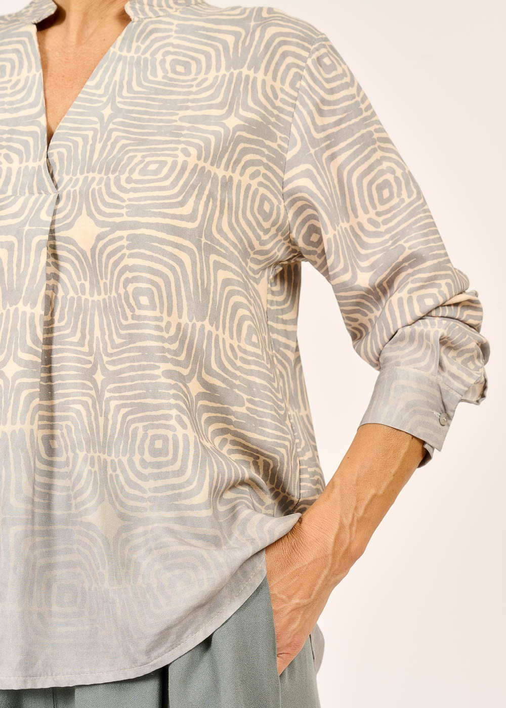 Diese Tunikabluse verführt mit einem faszinierenden Muster, das wie ein geheimnisvolles Labyrinth wirkt und den Blick immer wieder aufs Neue fesselt. Der fließende Schnitt sorgt für mühelosen Tragekomfort und unterstreicht die feminine Silhouette auf elegante Weise. Ein einzigartiges Statement-Piece, das Kunst und Mode auf spielerische Weise verbindet.