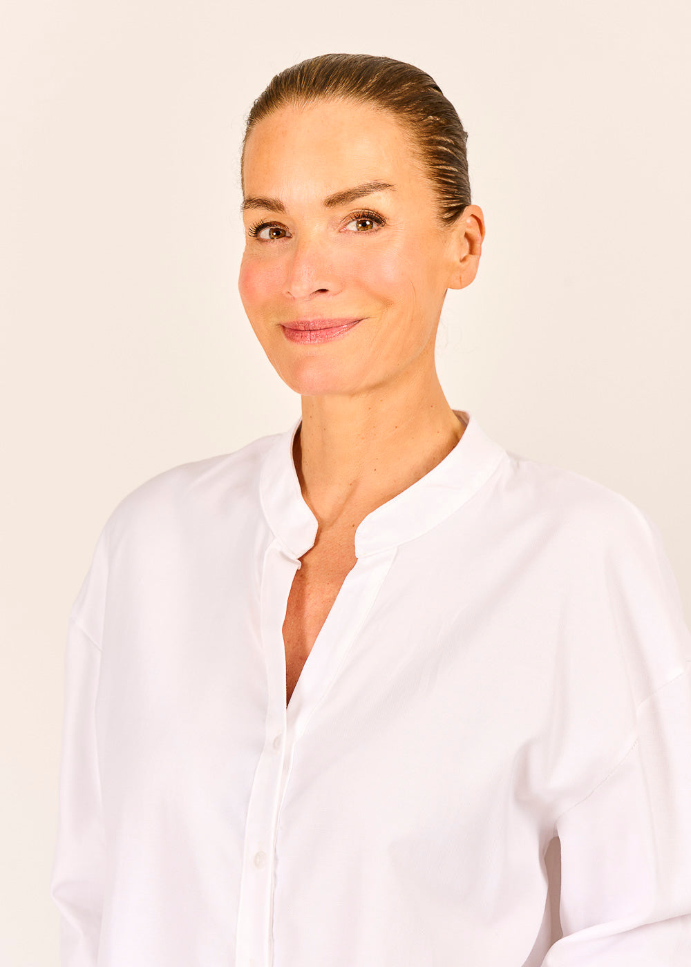 Diese strahlend weiße Bluse ist ein zeitloses Essential, das Eleganz und lässigen Chic perfekt vereint. Der moderne Stehkragen ohne klassischen Umschlag (Mao-Kragen-Stil) verleiht ihr eine minimalistische und zugleich anspruchsvolle Note. Dank ihres lockeren, fließenden Schnitts lässt sich dieses vielseitige Basic mühelos zu allem von Jeans bis hin zu eleganten Stoffhosen kombinieren.