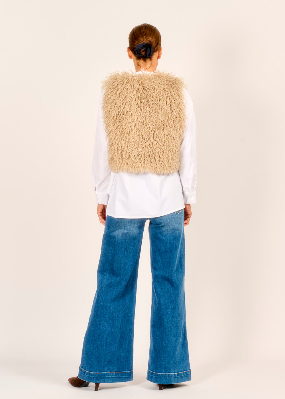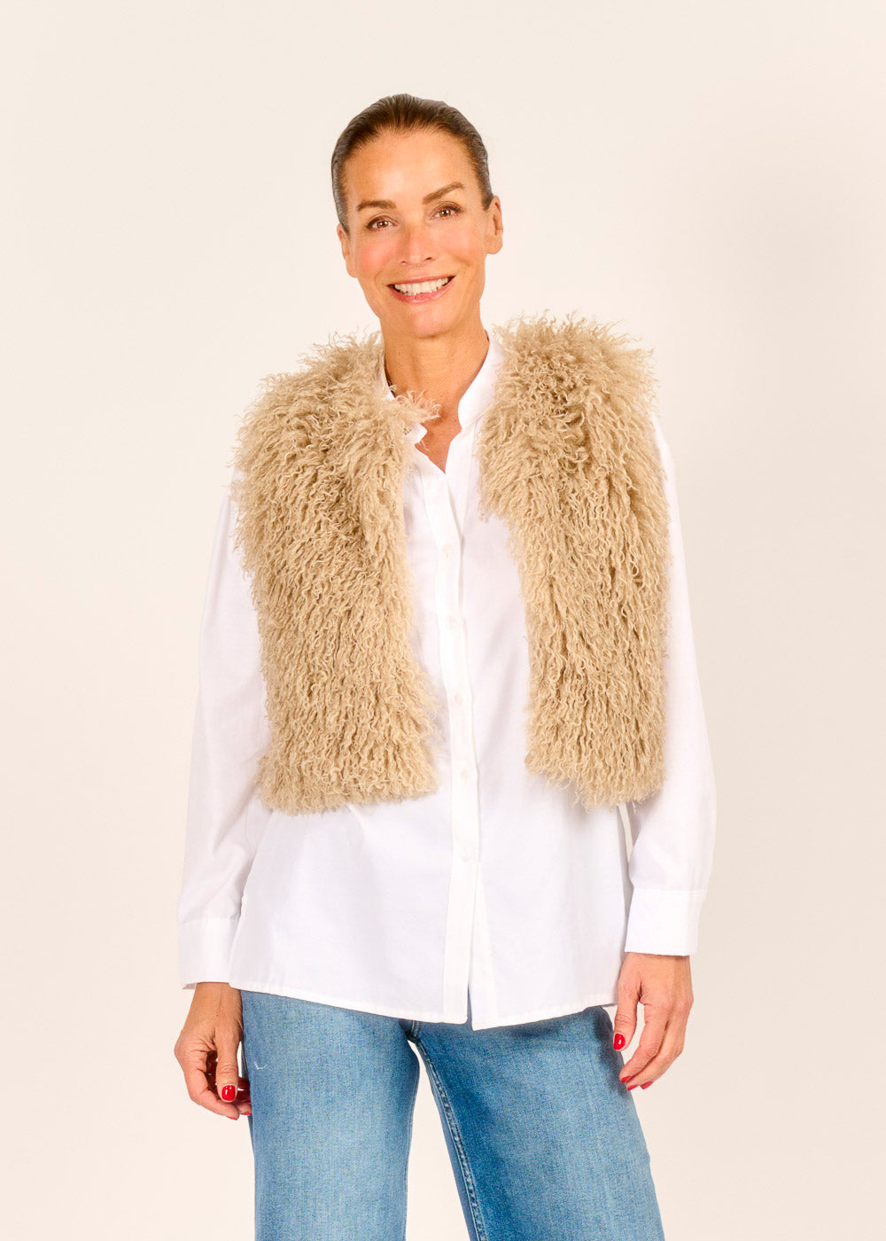 Ein luxuriöses Statement-Piece: Unsere Fake Fur Weste ist ein absoluter Blickfang für jede Garderobe. Das unglaublich weiche, voluminöse Material in hellem Beige fühlt sich an wie echter Pelz und verleiht deinem Look sofort eine edle Textur. Über einer schlichten Bluse oder einem Strickteil getragen, sorgt diese Weste für einen stylischen und warmen Akzent.