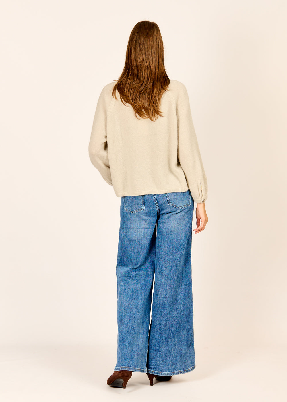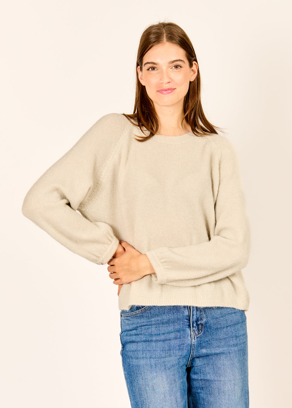Verliebe dich in unseren gemütlichen Pullover in der edlen Farbe Argento. Das weiche, flauschige Material sorgt für ein wunderbar angenehmes Tragegefühl, während der kleine Knopf am Ärmel ein dezentes und raffiniertes Detail setzt. Mit seinem zeitlosen Design ist dieser Pullover ein vielseitiger Begleiter, der sich perfekt zu Jeans und Röcken kombinieren lässt.
