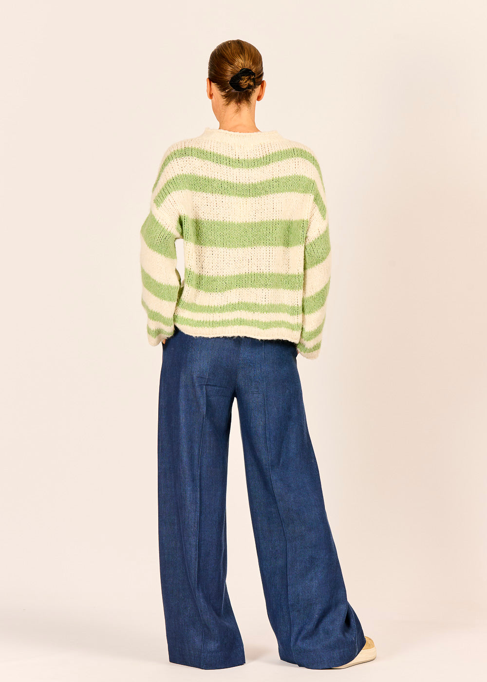 Dieser grob gestrickte Streifenpullover in einer fröhlichen Kombination aus sanftem Pastellgrün und hellem Creme ist ein kuscheliges Statement-Piece für die Übergangszeit. Das voluminöse Garn und der lockere Schnitt garantieren höchsten Tragekomfort und eine moderne, entspannte Silhouette. Er ist die perfekte Wahl, um schlichten Hosen wie dieser eleganten blauen Wide-Leg-Hose einen modischen Farbtupfer zu verleihen.