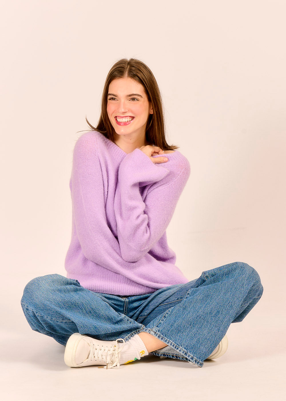 Der weiche, lilafarbene Strickpullover umhüllt und wärmt dich dank des Anteils an Baby Alpakawolle. Sein Carmenausschnitt sowie die ausgestellten Arme verleihen dem lässigen Design eine besondere Raffinesse. Der frische Farbton lässt sich besonders schön mit Denim oder hellem Cord kombinieren.