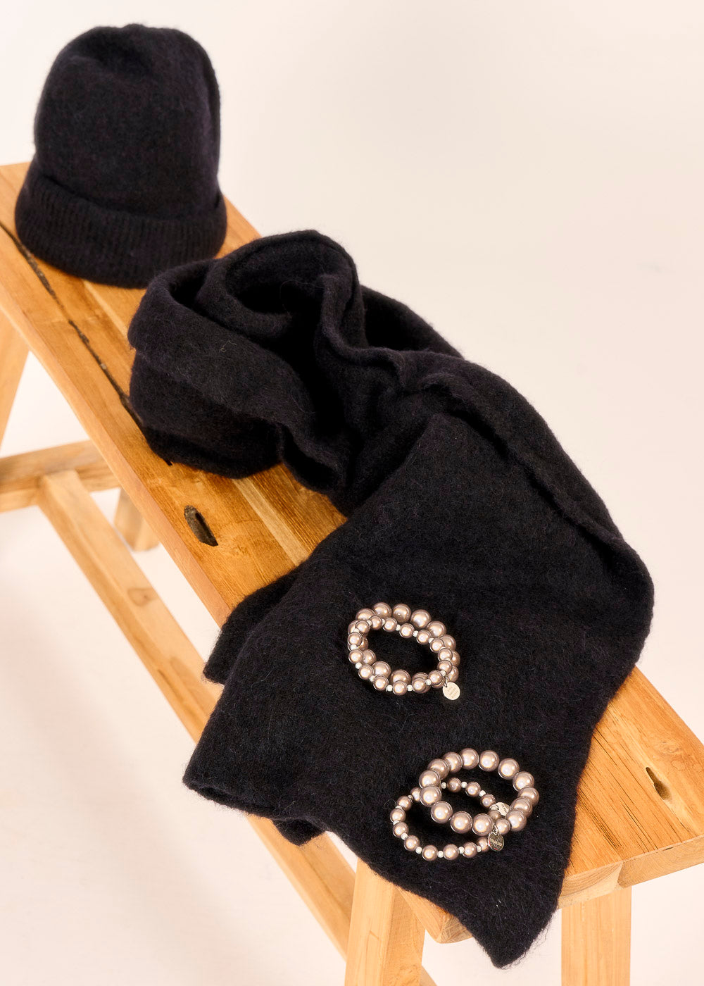 Tauche ein in luxuriösen Komfort mit unserem Schal Sciarpa Babyalpaca in edlem Nero – weich wie ein Hauch von Wolken und gleichzeitig warm genug für die kältesten Tage. Die perfekte Harmonie aus Stil und Funktion wird durch die passende Mütze abgerundet, die jedem Outfit eine elegante Note verleiht. Ein Duo aus Schal und Mütze, das klassische Eleganz mit unwiderstehlicher Gemütlichkeit vereint.