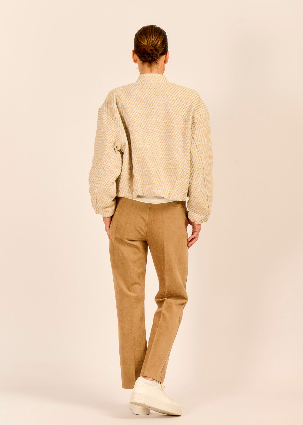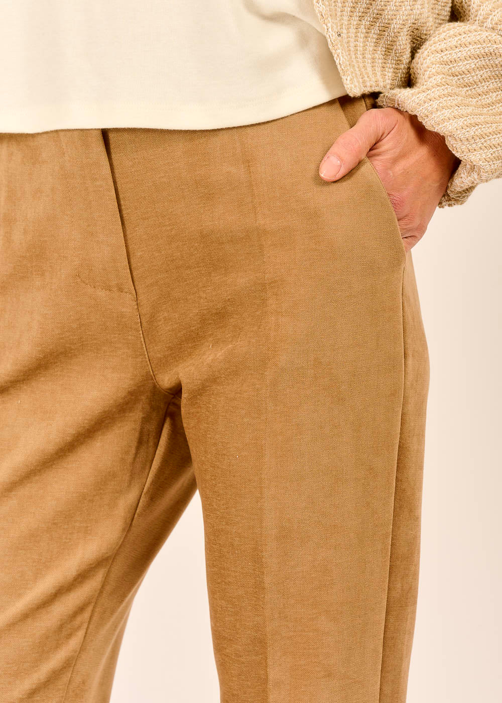 Der warme Karamellton macht die schmale Hose zum harmonischen Stylingpartner für helle Looks und lässt sich vielseitig kombinieren – ob lässig mit Bomberino oder elegant mit Bluse.