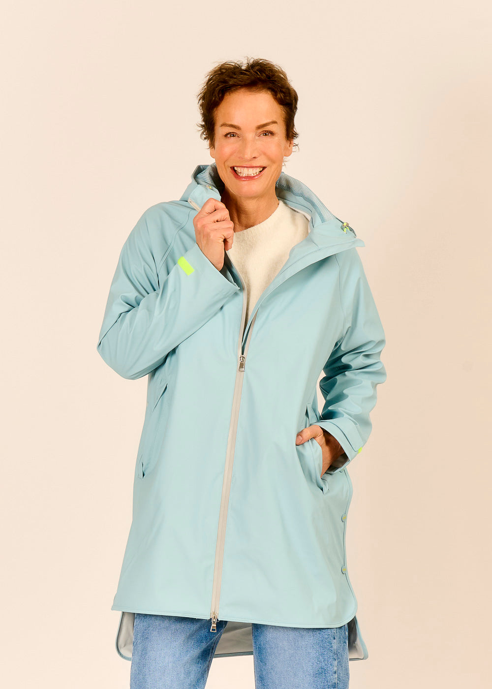 Der himmelblaue Regenmantel von COMO No. 1 ist ein stilvoller Begleiter für graue Regentage. Die Kapuze schützt zuverlässig vor Wind und Wetter, während farbige Akzente dem Mantel eine fröhliche Note verleihen. Verstellbare Elemente sorgen für perfekten Sitz und zusätzlichen Komfort.