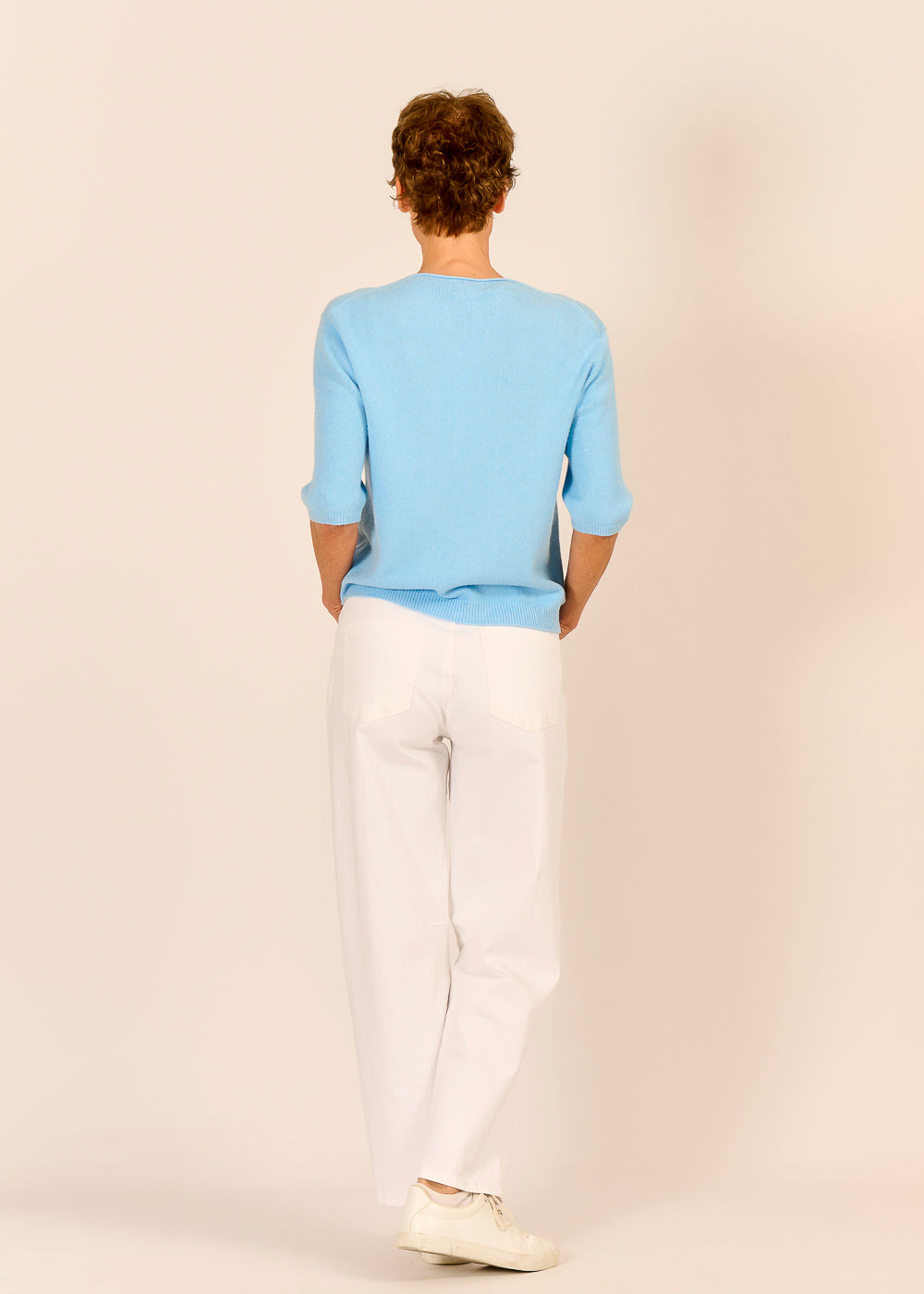 Der himmelblaue Halbarm-Pulli strahlt Ruhe, Eleganz und Frische aus. Dank des Viskoseanteils fühlt sich das Material angenehm weich auf der Haut an und ist perfekt für kühle Frühlingstage.