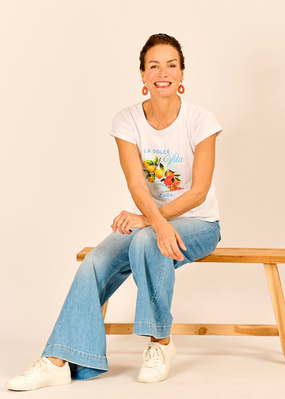 Ein Hauch von italienischer Leichtigkeit trifft auf zeitlosen Style: Dieses weiße Shirt mit dem Schriftzug „La Dolce Vita“ verkörpert pure Lebensfreude. Der klare Look wird durch den charmanten Print zu einem Statement für Genuss, Sonne und das süße Leben. Lässig kombiniert wird es zum perfekten Begleiter für alle, die jeden Tag ein bisschen Urlaubsgefühl tragen möchten.