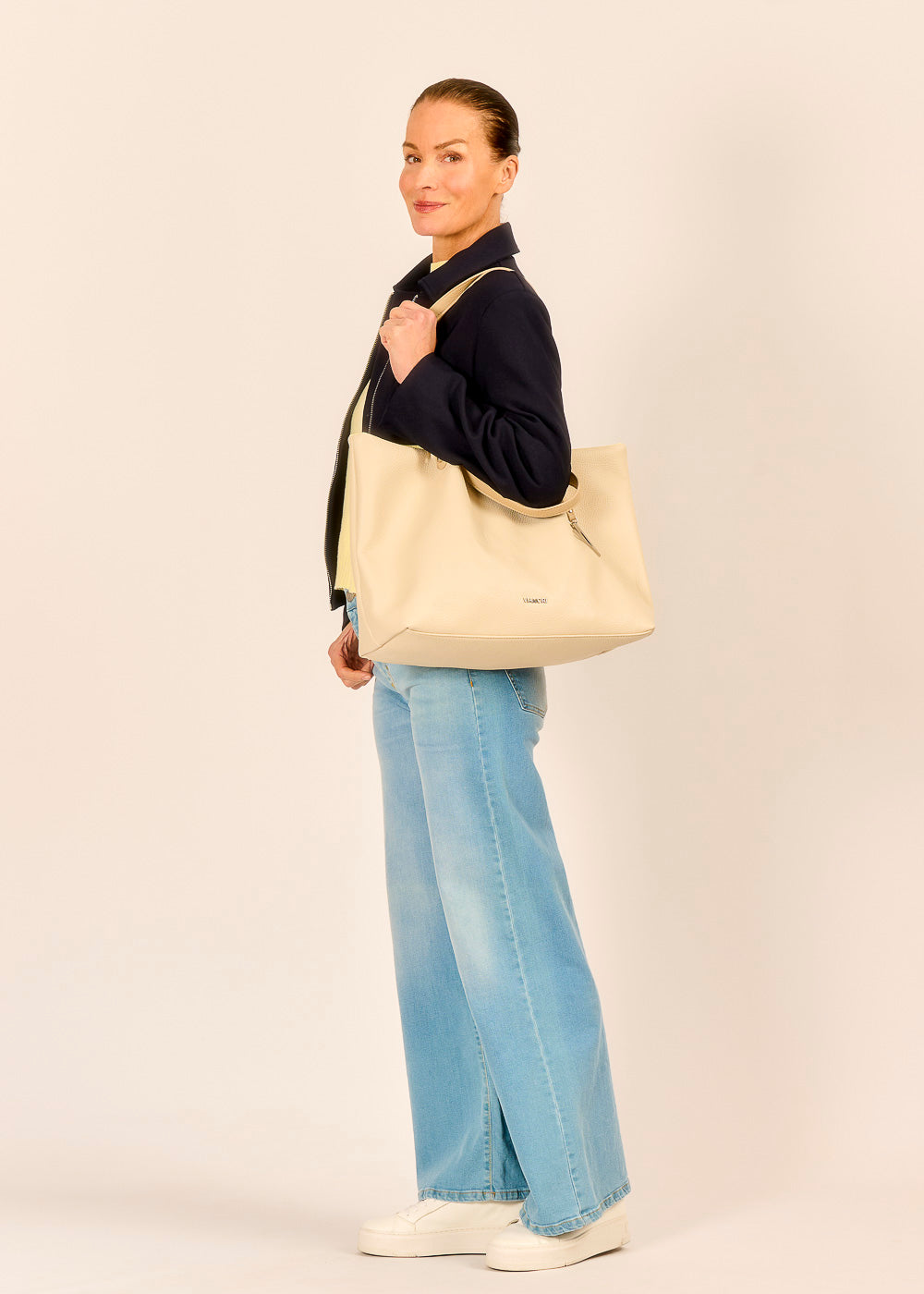 Dieser Shopper ist ein überraschendes Multitalent und dein praktischer und stilvoller Begleiter für den Alltag. Das neutrale Beige passt zu jedem Outfit, während die Innentasche einen überraschenden Farbtupfer setzt und gute Laune garantiert. Die clevere Innentasche ist nicht nur ein Ordnungwunder, sondern strahlt auch einzeln.