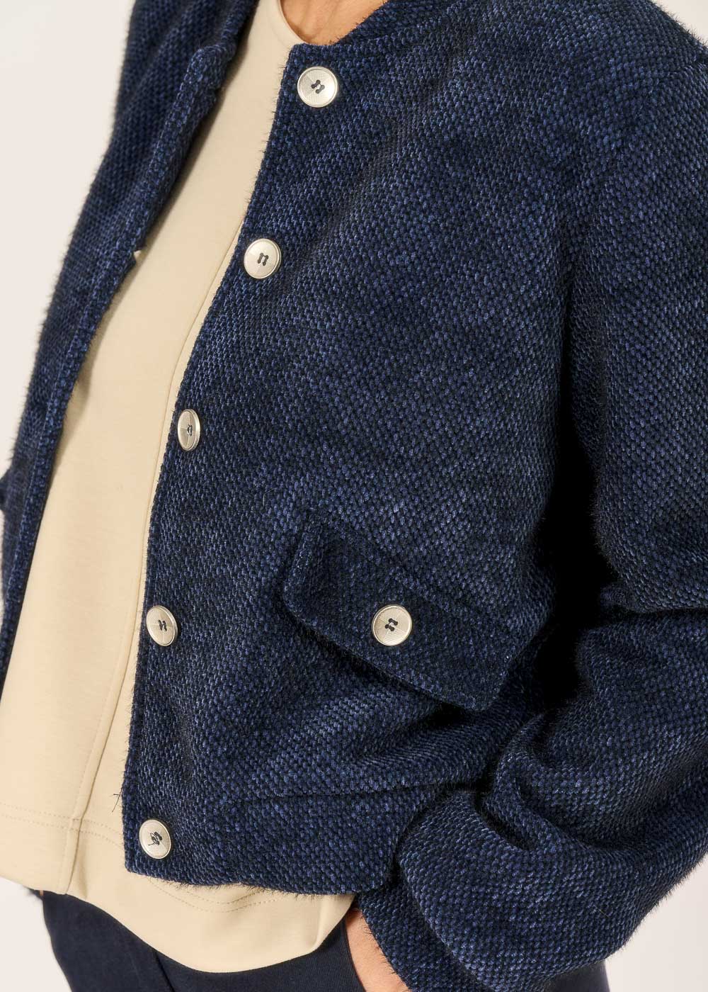 Dieses kurze Bomberino in tiefem Blu Scuro (Dunkelblau) ist ein sehr stylisches und modernes Statement-Piece, das eine lässige Silhouette mit eleganter Textur vereint. Besonders edel wirken die kontrastierenden, großen, perlmuttartigen Knöpfe, welche der Jacke einen einzigartigen, hochwertigen Akzent verleihen. Tragen Sie diese charmante Strickjacke als schicken Ersatz für einen Blazer, um Ihrem Outfit sofort einen frischen und modischen Twist zu geben.