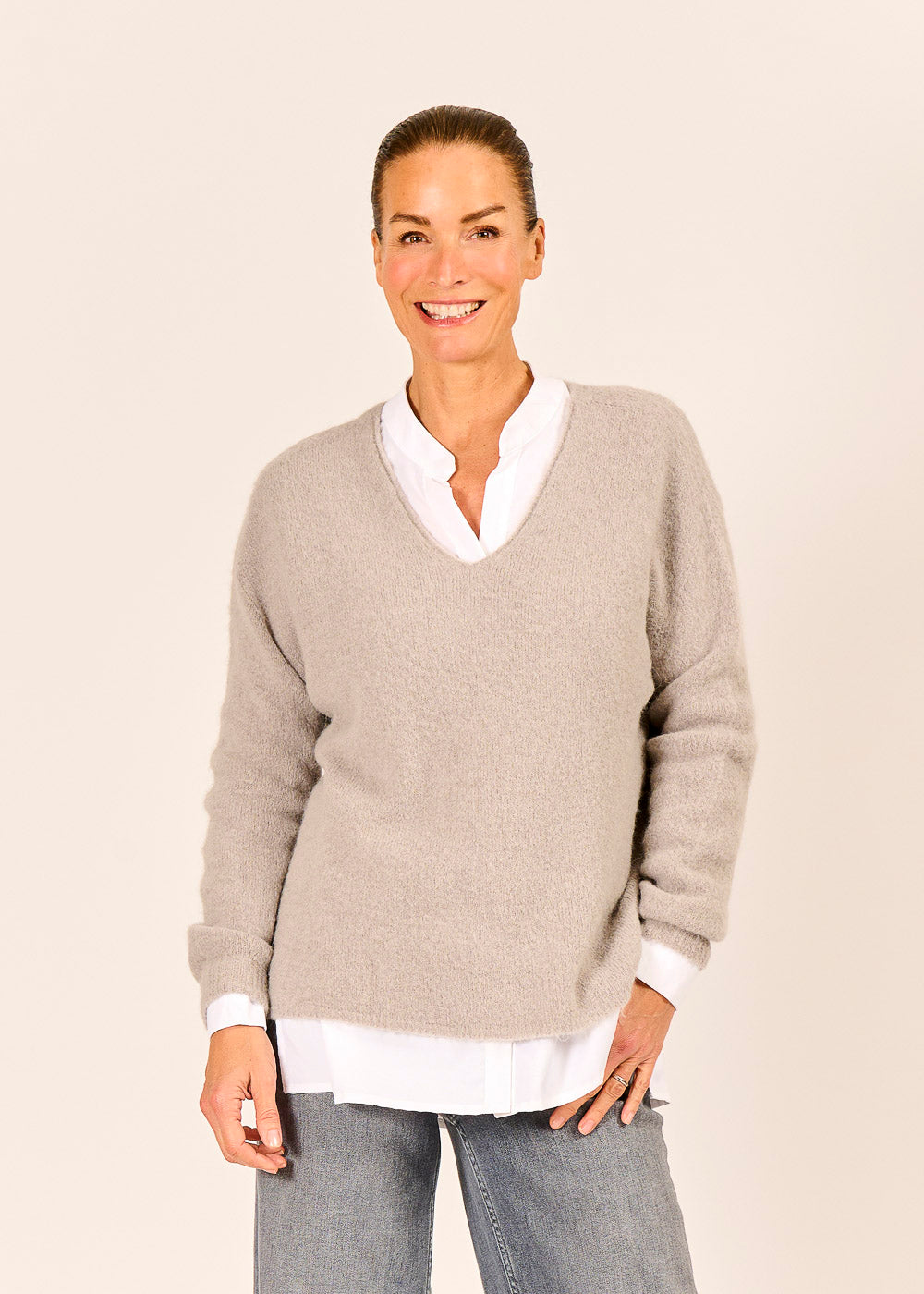 Dieser lässige V-Pullover in einem sanften Grigio-Ton ist das ultimative Layering-Essential für einen mühelos schicken Look. Die lockere Silhouette und der tiefe V-Ausschnitt eignen sich perfekt, um ihn über einer klassischen weißen Bluse oder einem Shirt zu tragen. Dank des weichen, hochwertigen Materials ist er unglaublich gemütlich und verleiht Ihrem Alltags-Outfit eine sofortige Dosis anspruchsvoller Eleganz.