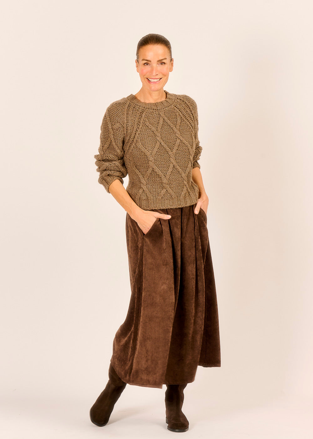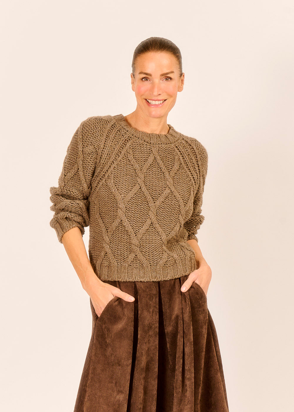 Dieser herrliche Pullover in einem warmen, eleganten Kakao-Ton umhüllt Sie mit einer rustikalen Gemütlichkeit, perfekt für kühle Tage. Das Zopfmuster zieht sich all over über das gesamte Modell, nicht nur vorne, und verleiht dem Strickstück eine beeindruckende Textur und hochwertige Tiefe. Kombinieren Sie diesen luxuriösen Pullover mit Röcken oder Hosen für einen stilvollen Look, der traditionelle Handwerkskunst und modernen Komfort vereint.